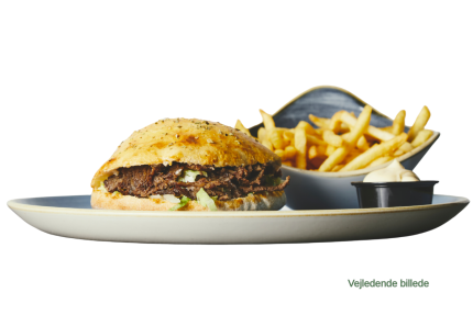 Husets burger med 250g hakkebøf, bacon, løg, ost og med pommes frites eller kartoffelbåde, dyppelse og 0,50 L sodavand
