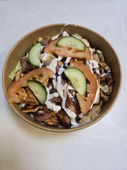 Med dressing og flute. Vælg mellem Thousand Island og creme fraiche.